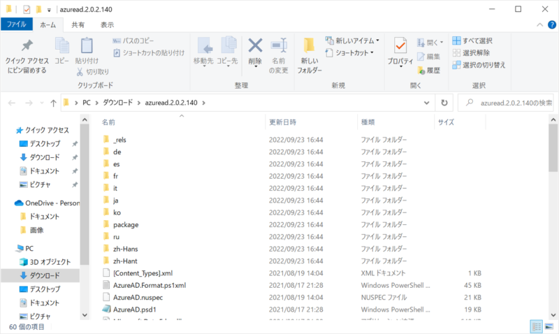 続いて、ブロック解除したファイル「azuread.x.x.x.nupkg」の拡張子を「zip」に変更し、解凍します。