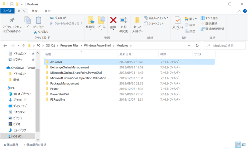 ここに表示されたフォルダのいずれかに、展開した「AzureAD」フォルダをコピーすることでインストールは完了です。