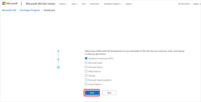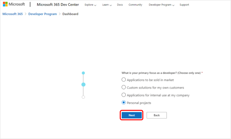 Microsoft365開発プログラムの用途を選択し[Next]で進みます。