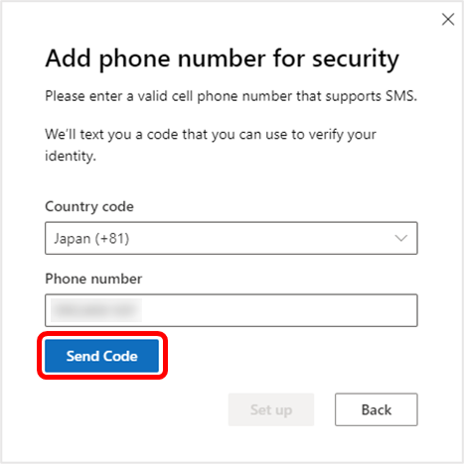 「Phone Number」に電話番号を入力し[Send Code]をクリックします。
