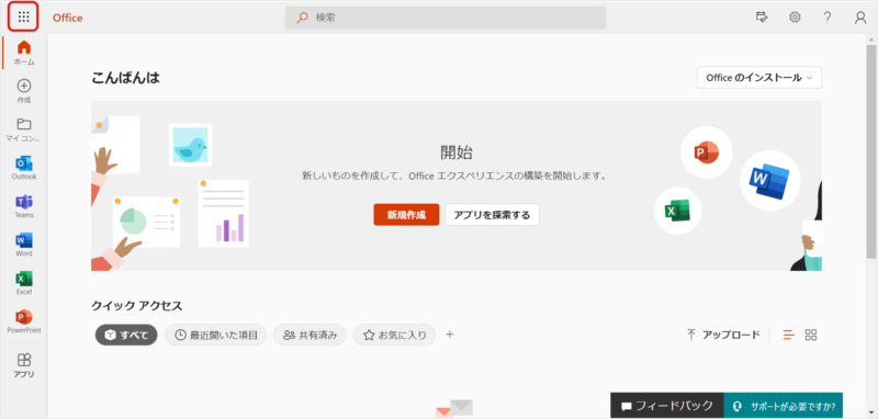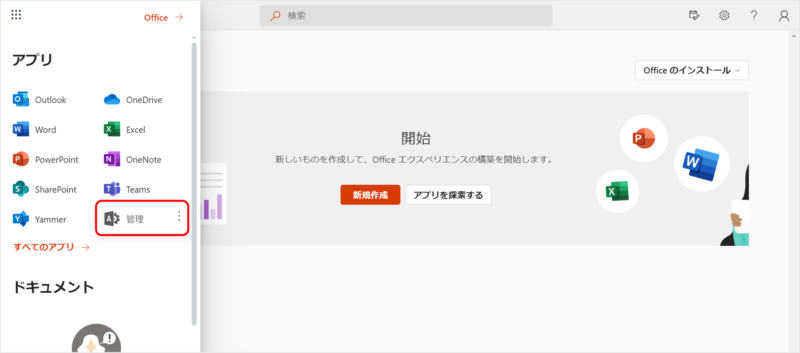 Officeホームが開きますので[メニュー]からMicrosoft365管理センターに遷移しましょう。
