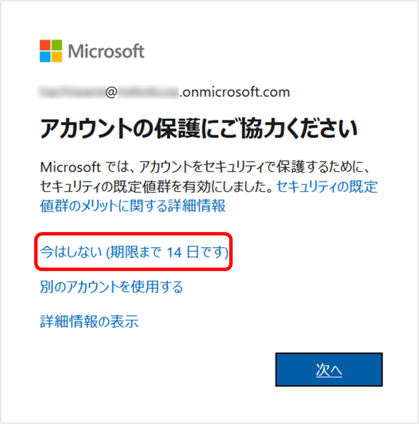 [今はしない]でスキップすることも可能ですが、セキュリティポリシーにより期限内に設定する必要があるため時間があるときにやっておきましょう。
