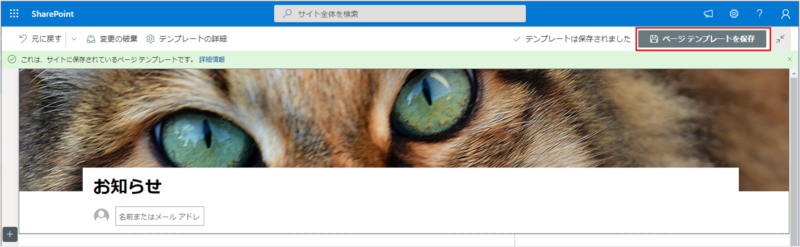 ヘッダー画像の上に「これは、サイトに保存されているページテンプレートです。」と表示されるようになります。