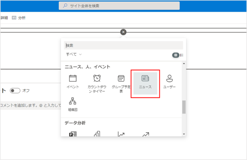 WEBパーツの追加方法としては、セクション内の+マークから「ニュース、人、イベント」カテゴリの「ニュース」をクリックです。