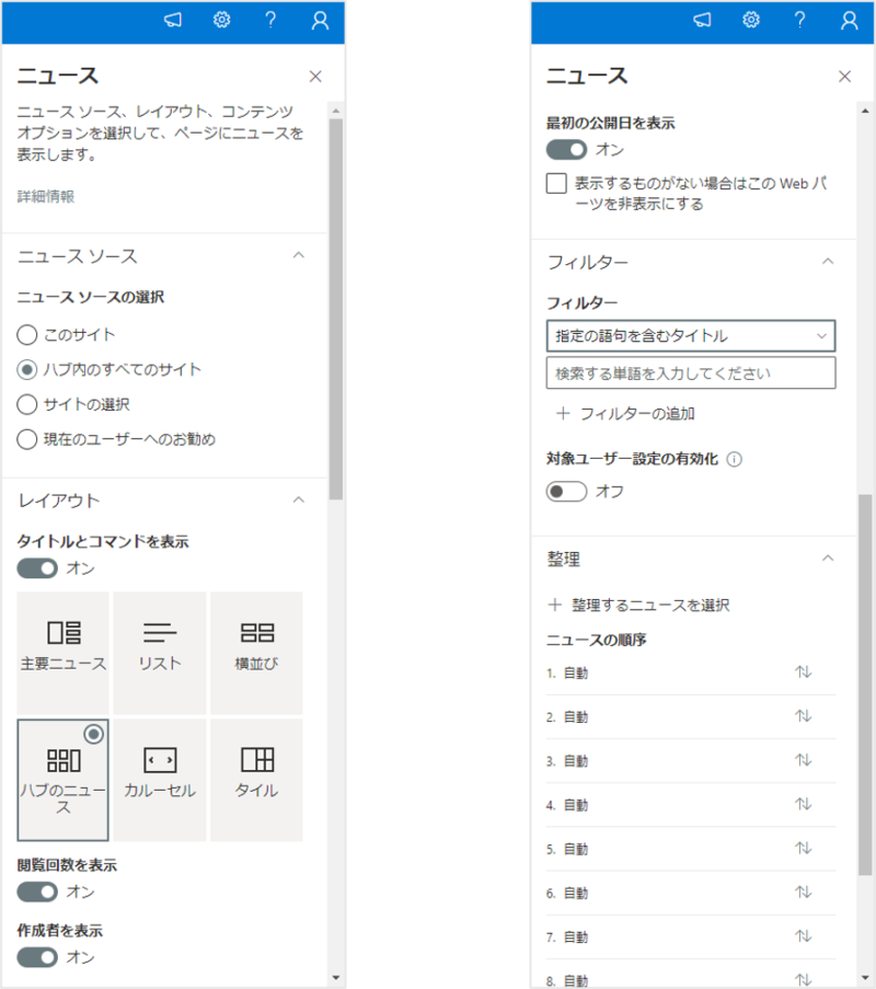 ニュースを取得するサイトの選択や各種レイアウト設定、閲覧回数・作成者・公開日の表示設定、フィルターによる絞り込み、対象ユーザー設定、ニュースの整理などの項目が並んでいます。