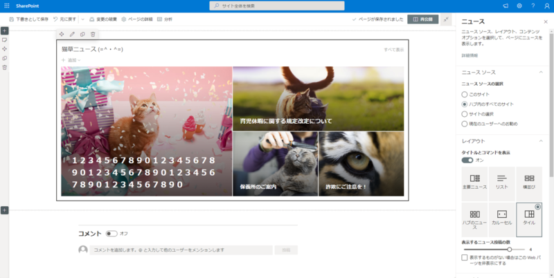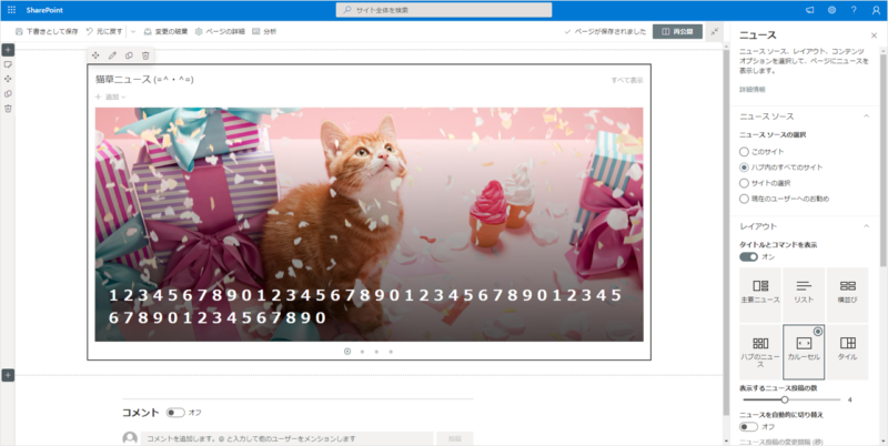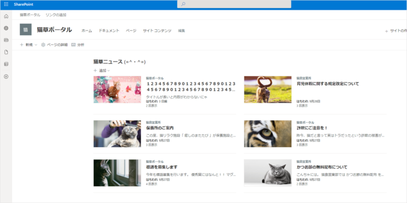 なお、強調表示されたコンテンツWEBパーツはニュースやドキュメントが投稿されてからパーツ内に表示されるまでにタイムラグがあります(SharePointの内部インデックス処理が完了したアイテムから表示されるため)。