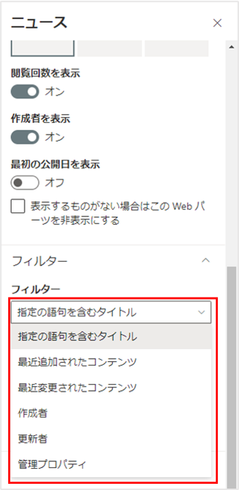 「指定の語句を含むタイトル」「最近追加されたコンテンツ」「最近変更されたコンテンツ」「作成者」「更新者」などの項目でフィルターが行えます。