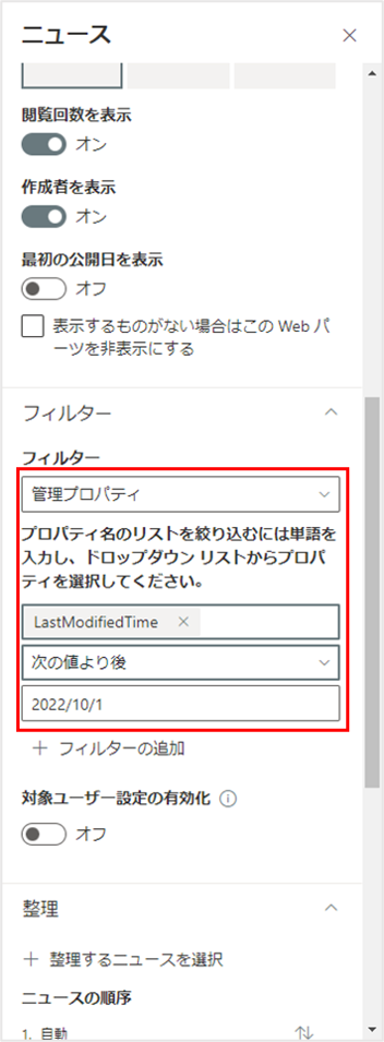 ニュースWEBパーツの設定画面で「対象ユーザー設定の有効化」をオンに設定します。