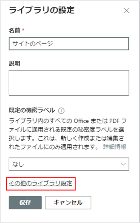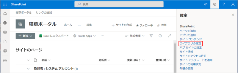 「サイトのページ」ライブラリを開き、「ライブラリの設定」をクリックします。