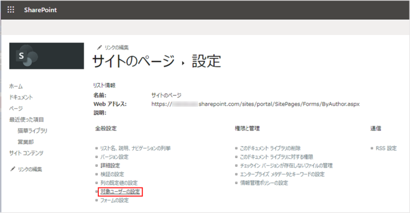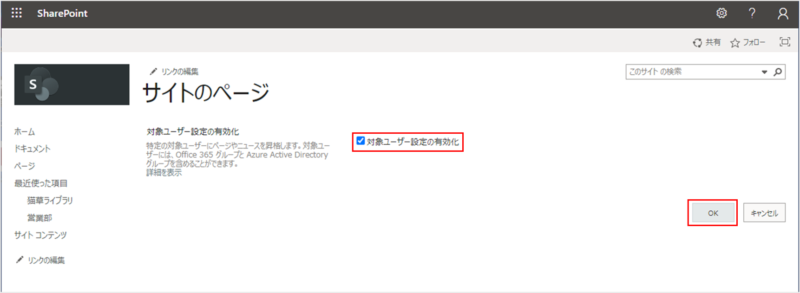 まず「サイトのページ」ライブラリでの「対象ユーザー設定の有効化」を行います。