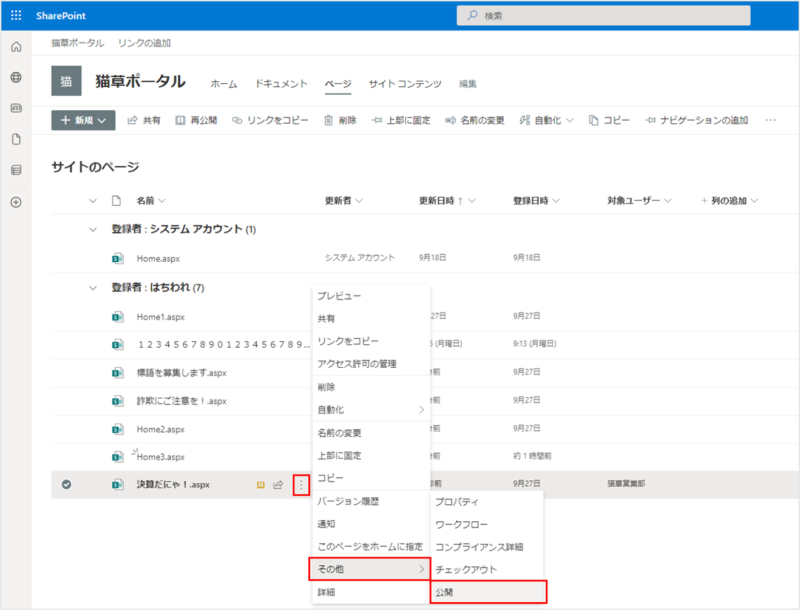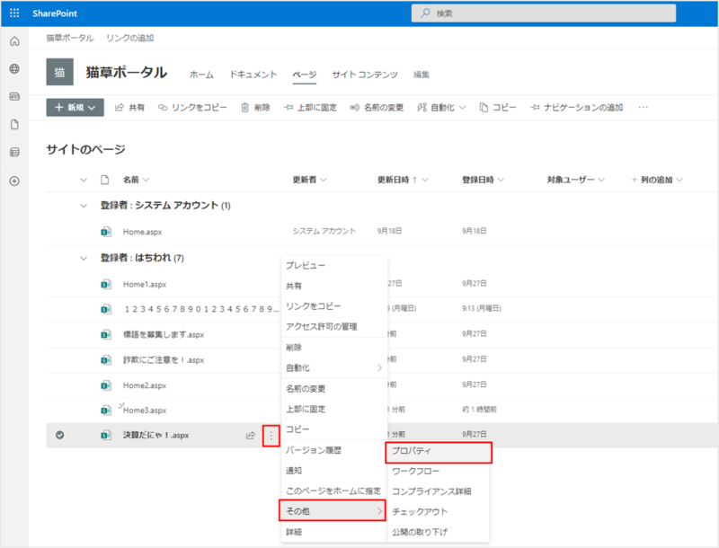 「サイトのページ」ライブラリで対象の記事を選択し、メニューの[その他]-[プロパティ]をクリックします。