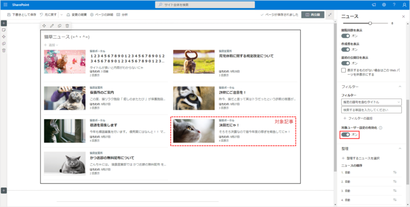 対象ユーザー設定を有効にすることで、サインインしているユーザーを判別し、特定のニュースを表示させるかさせないかを判断させることができます。