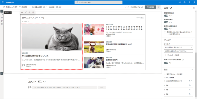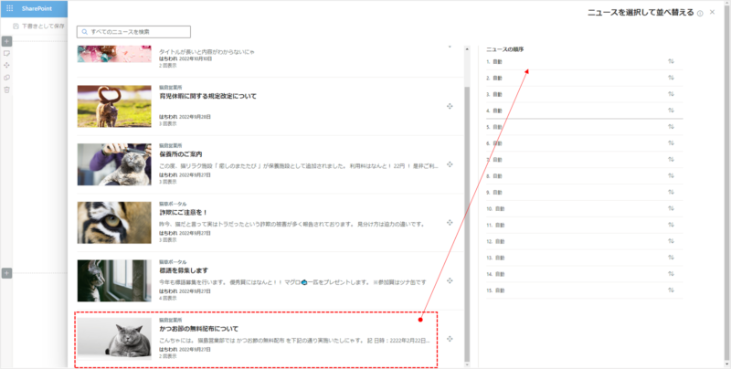 ニュースWEBパーツは任意の順序でニュース記事を配置することができます。