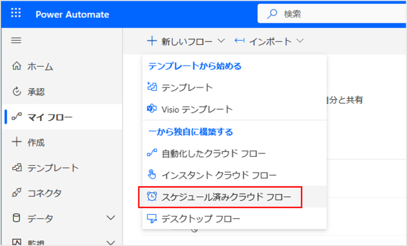 [マイフロー]から「+新しいフロー」をクリックし、「スケジュール済みクラウドフロー」をクリックします。