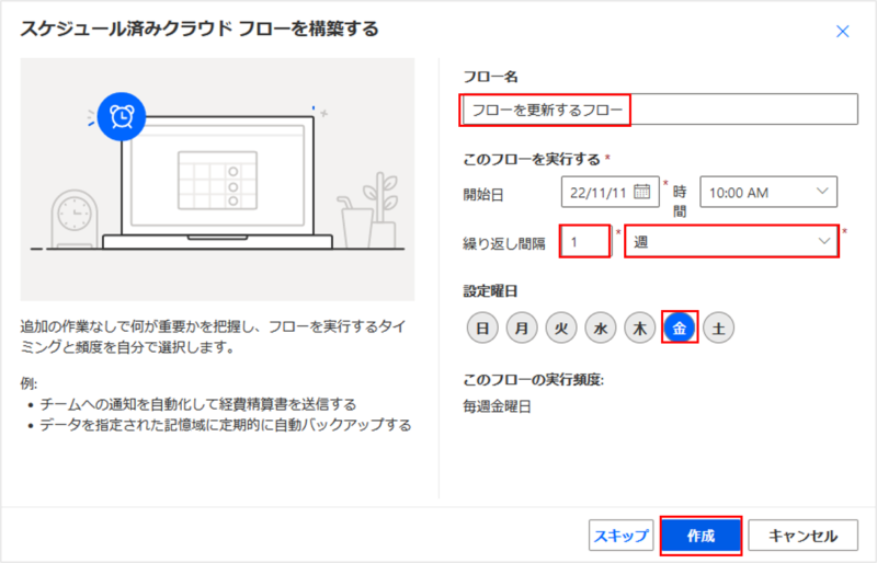 フロー名と繰り返し間隔を設定し、[作成]をクリックします。