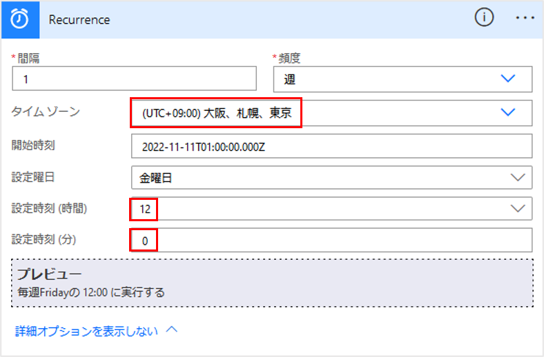 トリガー「Recurrence」でタイムゾーン(UTCL09:00 大阪、札幌、東京)と設定時刻(時間・分)を設定します。
