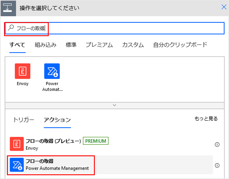 「+新しいステップ」をクリックし、「フローの取得」アクションを追加します。