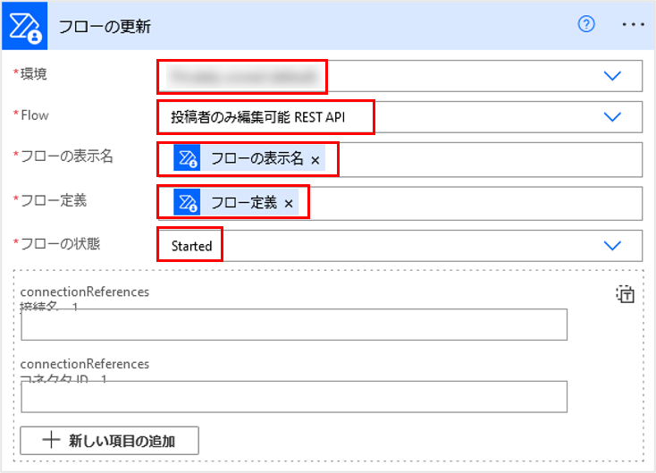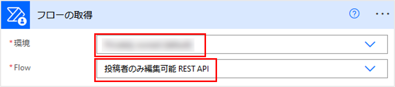 環境で自テナントを選択、Flowは更新処理を行う対象のフローを選択します。