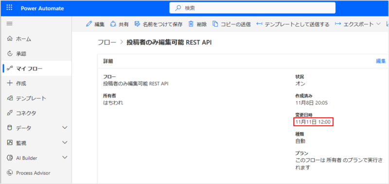トリガーとなる日時を経過した後、対象のフローのホーム画面を開き、変更日時を確認してみました。