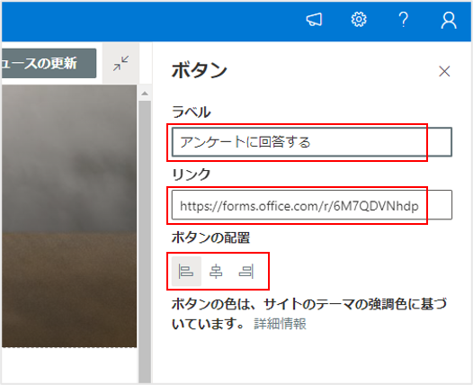 こちらも設定内容はシンプルで、ボタン内に表示する文字列とリンク先URL、あとボタンの表示位置を設定することが可能です。