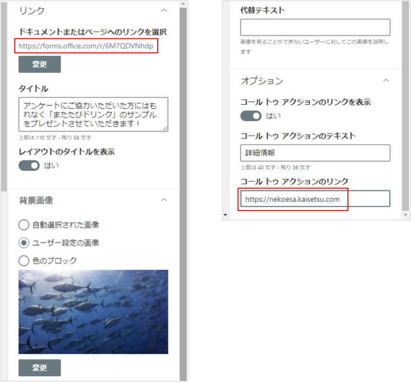 このWEBパーツが特殊なのは、メインのリンク先とCTAのリンク先の2つを設定できるところです。