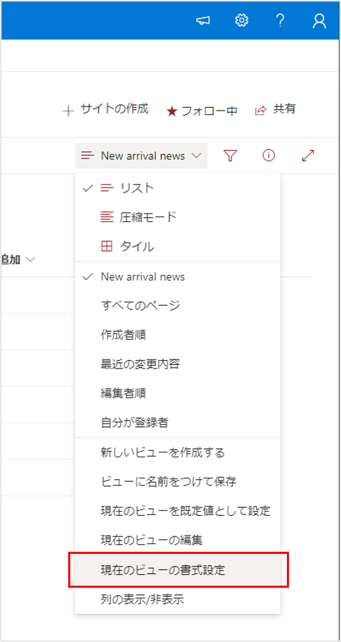 対象のビューが選択された状態で「現在のビューの書式設定」をクリックします。