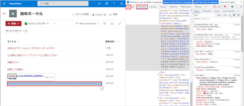 更に「ページ内の要素を選択して検査」をクリックし、検査対象の列(今回はタイトル列)をクリックします。